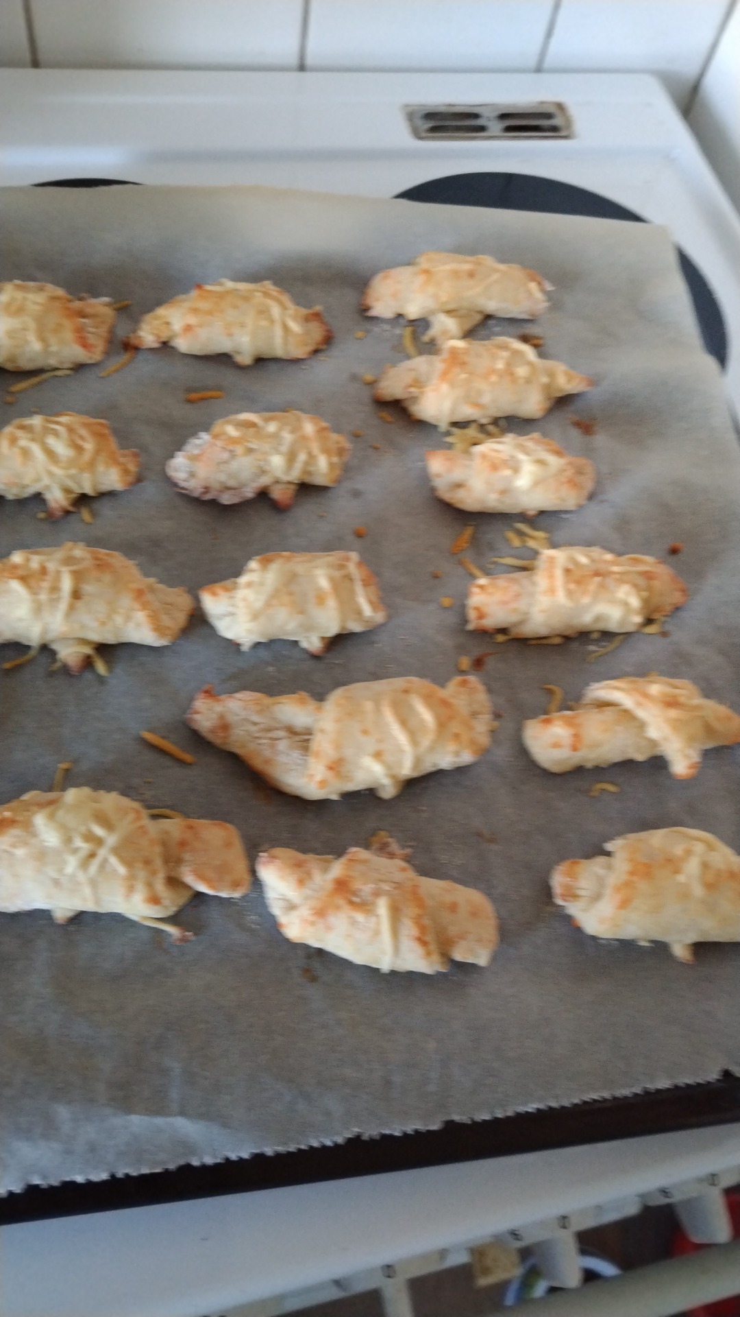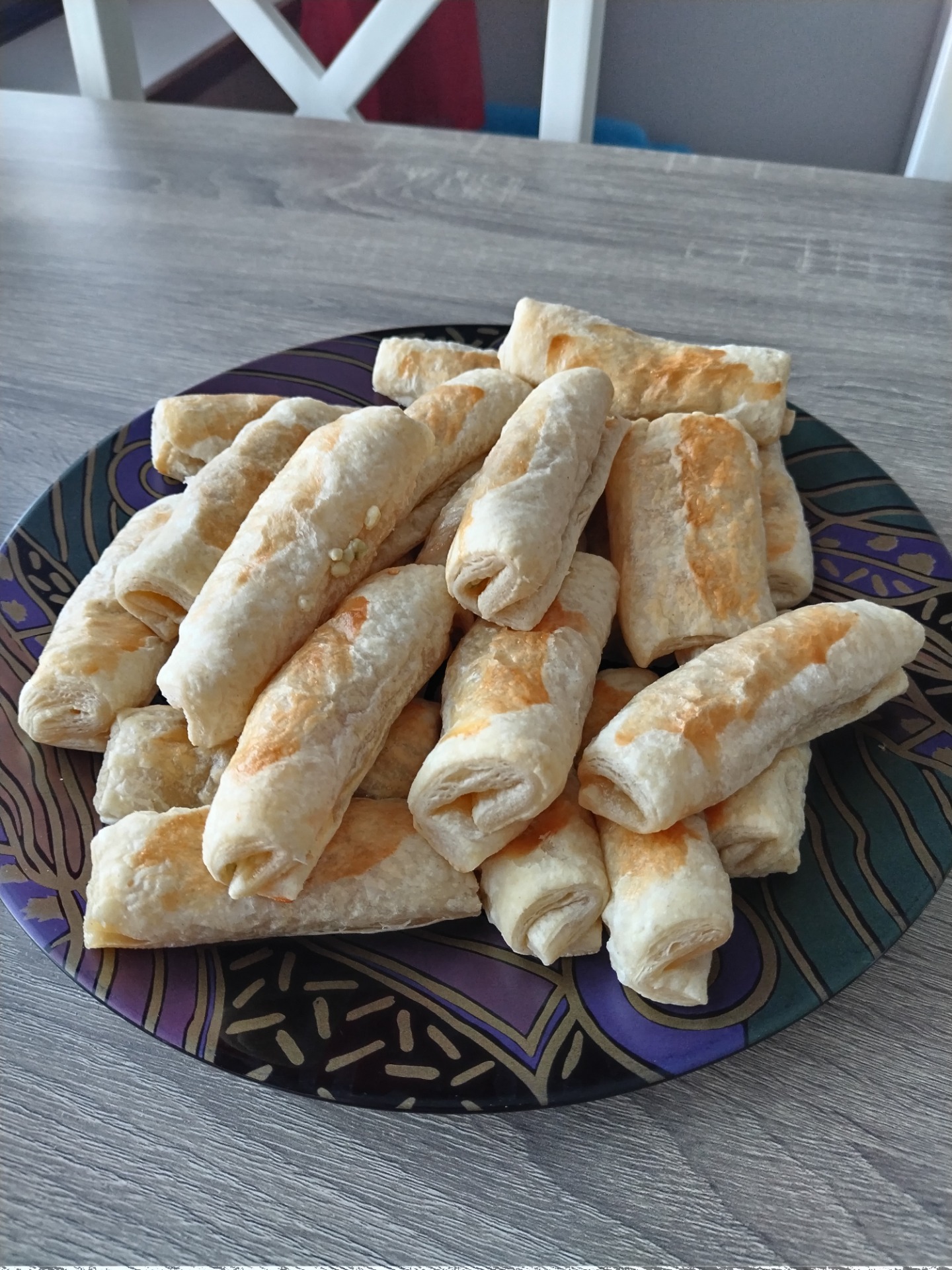 - Sulata lehtitaikinalevyt leivinpaperille levitettynä. - Kauli yksi levy pitkäksi. Laita alareunaan meetwursti, ripottele pinnalle aurajuusto ja rullaa siihen saakka kun täyte loppuu. Leikkaa rulla irti, painele sivut kiinni ja nipistä suppuun. Jatka samalla tavalla, yhdestä levystä saat kolme rullaa.