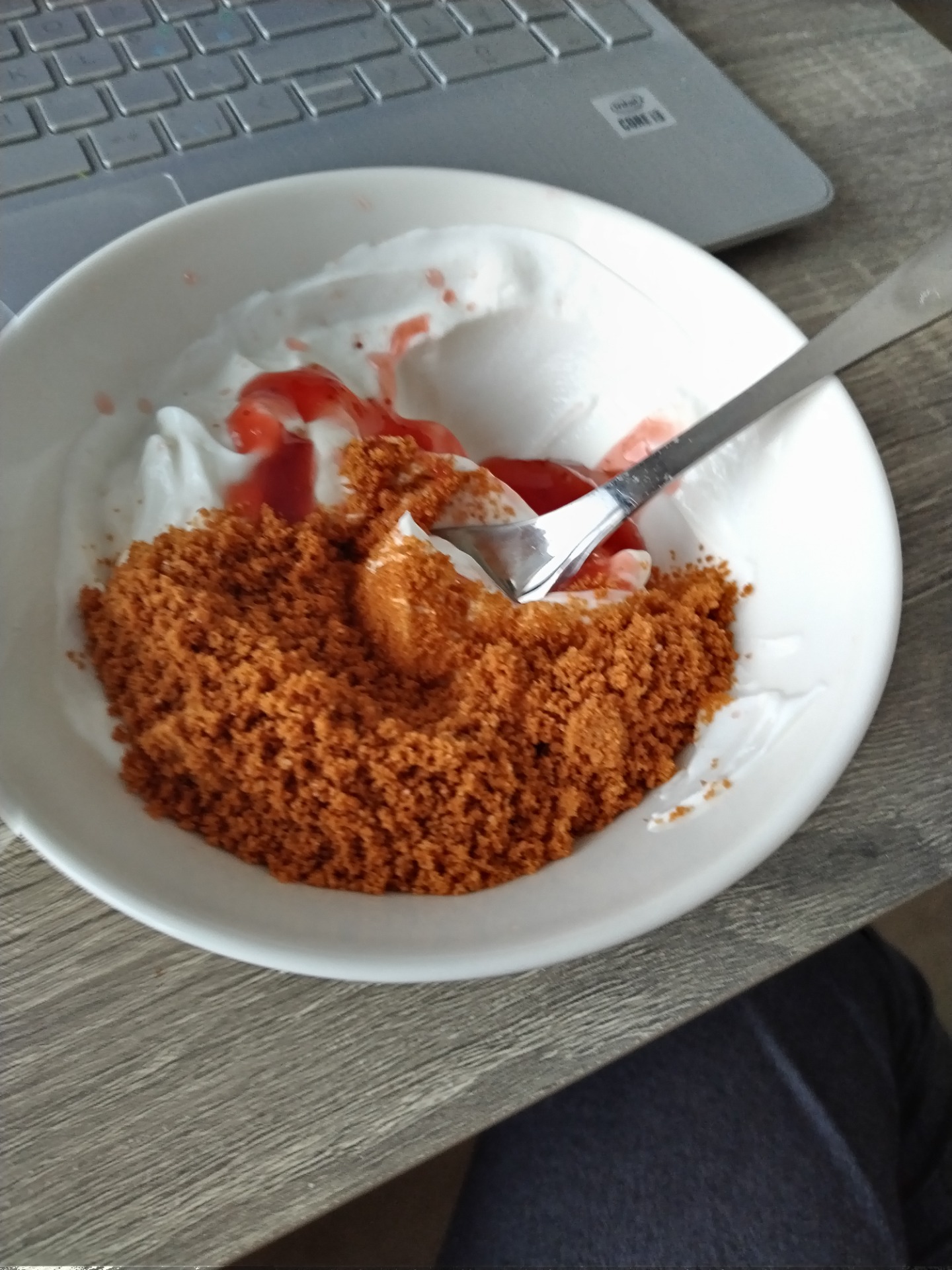 murskaa keksejä isää rahkatuorejuuston sekaan lopuksi mansikkahilloa päälle.