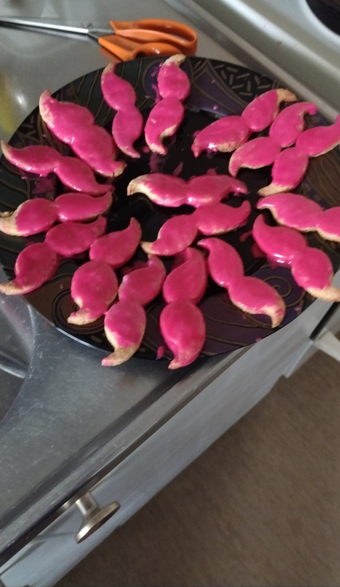 Pursota seittikuvio leivinpaperille. Siirrä leivinpaperi uunipellille ja nosta jääkaappiin pariksi tunniksi, kunnes kuvio on jähmettynyt. Jos pelti mahtuu pakastimeen, kuvio ehtii jähmettyä toista taikinaa valmistaessasi.