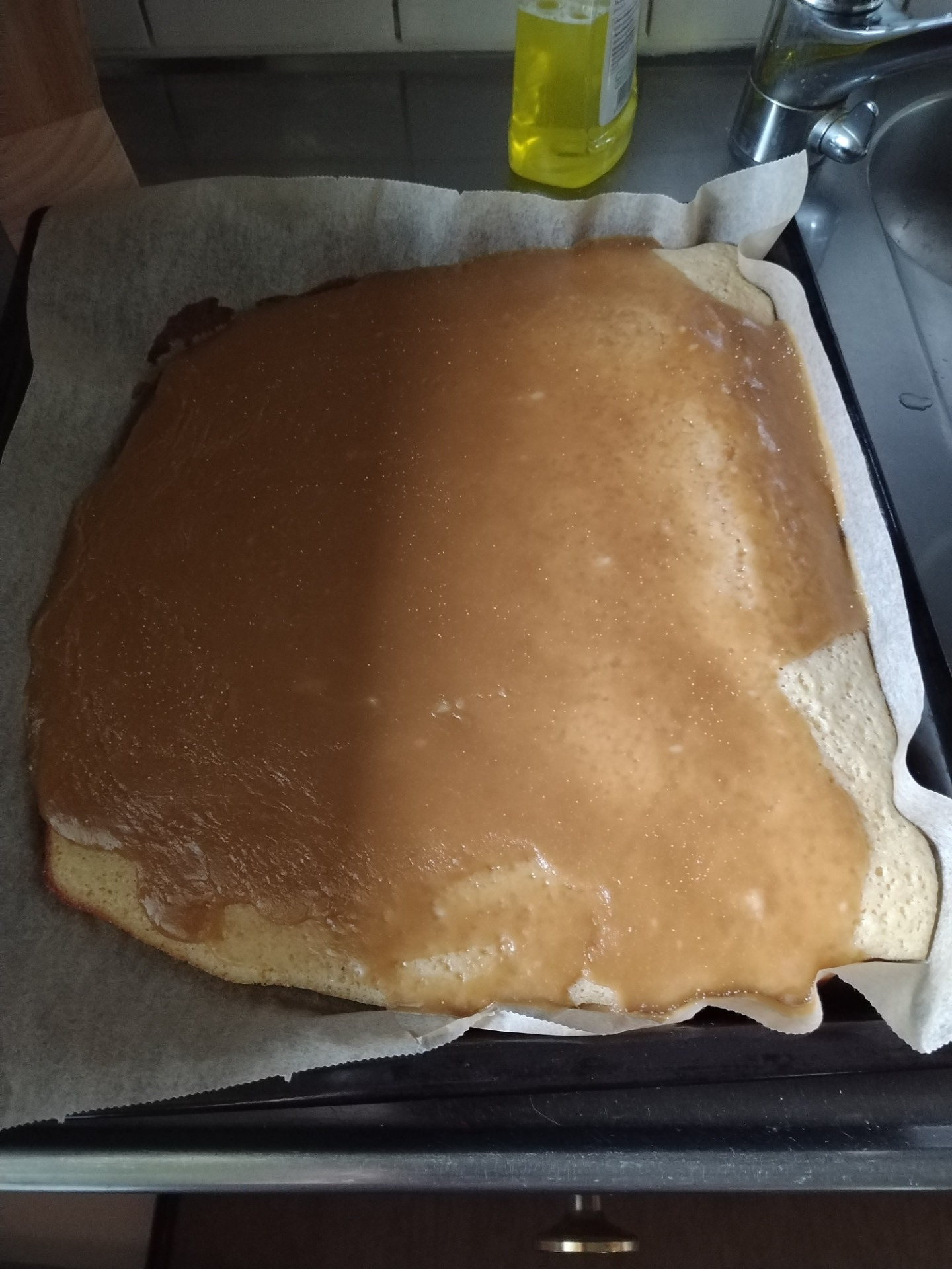 Vuoraa syvä uunipelti (noin 35 x 40 cm) leivinpaperilla. Kuumenna uuni 200 ℃:seen. Vatkaa munat ja sokeri vaaleaksi, paksuksi vaahdoksi. Sulata voi ja kääntele varovasti munavaahtoon. Sekoita kuivat aineet yhteen ja siivilöi munavaahtoon kevyesti käännellen vuorotellen maidon kanssa. Kaada taikina pellille ja paista noin 12–15 minuuttia. Anna jäähtyä hetki.